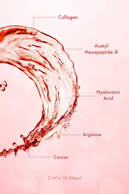 Aqua, Propylene Glycol, Collagen, Arginine, Polysorbate 20, Acetyl Hexapeptide-8, Caprylyl Glycol, Sodium Hyaluronate, Phenoxyethanol, Ethylhexylglycerin, Carboxymethyl Cellulose, Caviar Extract.