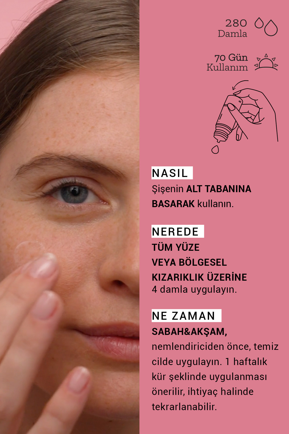 Pratik şişe tasarımı sayesinde kolay uygulama imkanı sağlar ve ürünün tazeliğini korur; – Çocukların ulaşamayacağı yerlerde saklanması önerisiyle güvenlik önlemleri alınmıştır; – Yatıştırıcı özelliği ile cildi sakinleştirir ve gün boyu rahat bir his bırakır;