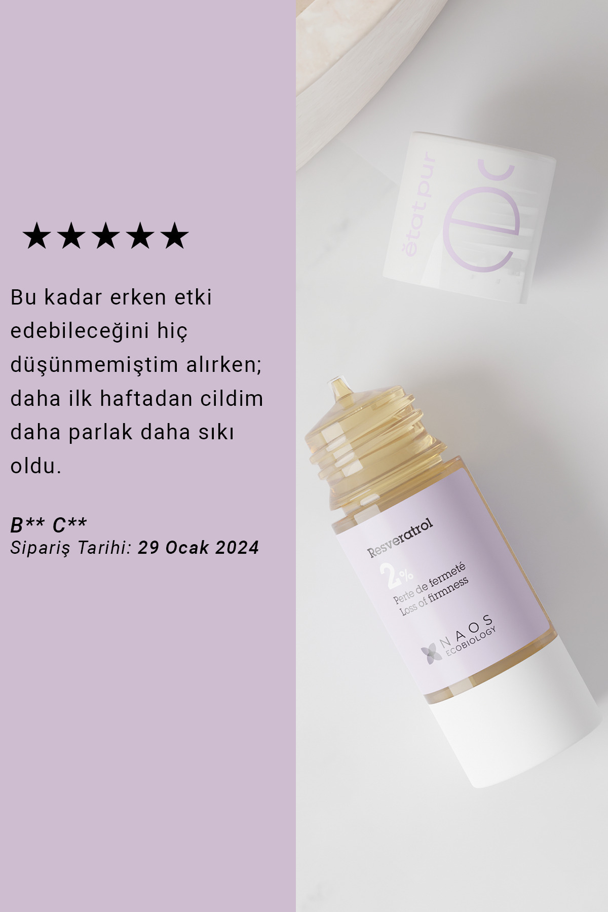 Etat Pur, size en iyi ürünleri sunmak için kozmetikte standart uygulamanın ötesine geçmeyi hedefleyen biyoloji, biyokimya, toksikoloji ve dermatoloji uzmanları tarafından tasarlanmıştır.; ; Cilt bakım ürünlerinin her bir bileşenini titizlikle seçilmekte olup, kozmetikte yaygın olarak kullanılan 30.000 bileşenden sadece saflığı, cilde uyumu ve güvenirliği yüksek 300 bileşen seçilmektedir.; ; Formüller cilt için gereksiz ve en önemlisi cildinize veya çevreye zarar verebilecek hiçbir şeyi içermez.; ; Bu, bedenlerimize, cildimize ve gezegenimize mutlak bir saygı göstergesidir.; ; Bordeaux asma dallarının özünden elde edilen Resveratrol güçlü antioksidan etkisi ile derin kırışıklık görünümünün azalmasına yardımcı olurken aynı zamanda cildi dış etkenlerden korur.; ; Güçlü bir antioksidan etkiye sahiptir.; ; Cilt tonunun daha eşit görünmesini sağlar.; ; Cildi yaşlanma sürecinden sorumlu serbest radikallerden korurken cildi yeniden yapılandırmaya yardımcı olur.